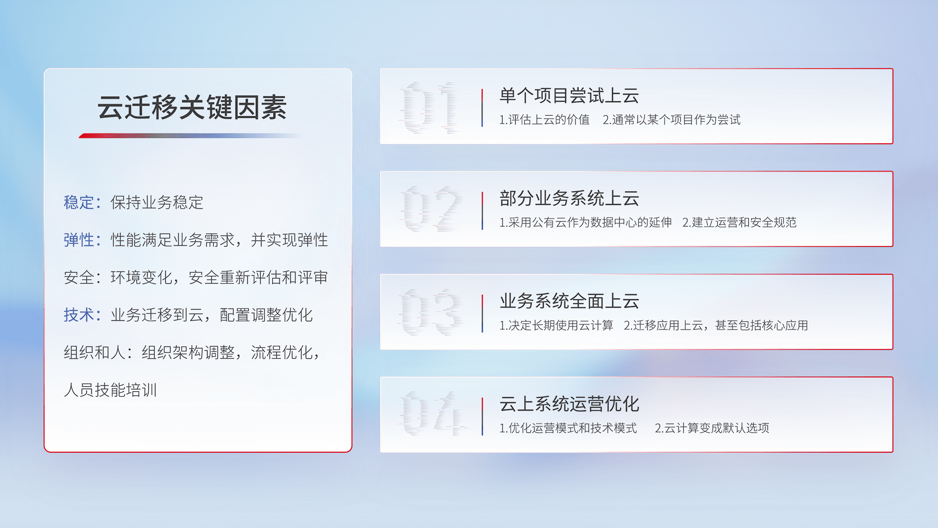 结合实际业务,,,,从规划设计、、、、云平台选型、、、云原生改造、、、数据迁移、、、集成交付,,,迁移全过程为客户识别最佳上云路径,,,做好风险识别管理,,,设计网络架构、、、身份权限、、、、安全审计合规、、、、操作审计、、日志审计、、、、监控告警策略、、、多站点容灾设计等,,对云上基础设施进行整体规划,,,,提升IT治理水平,,,,以满足弹性、、、、高可用、、、、高性能的需求。。。