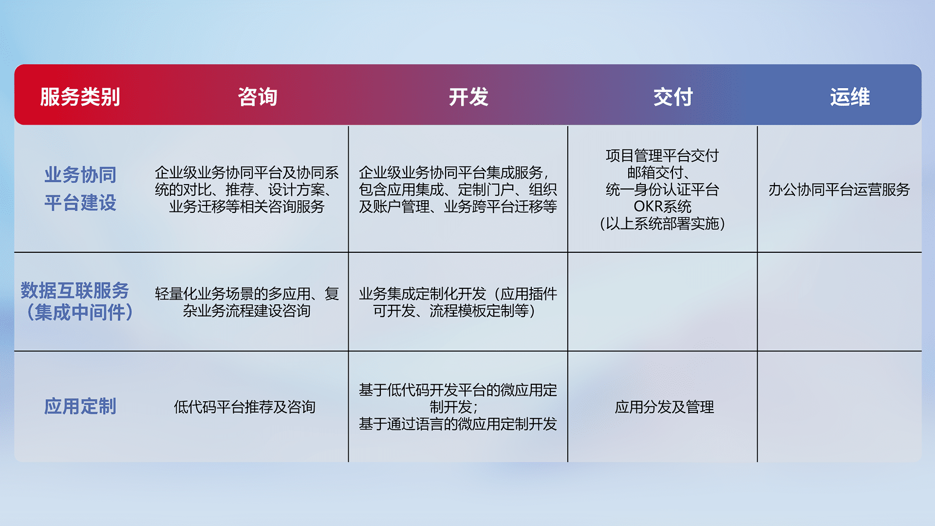 针对钉钉、、企微、、IDaas等平台级产品提供产品的规划、、、方案、、、交付、、、定制化开发等服务,,实现如统一协同办公、、、智能客户服务、、、、混合会议管理、、智能数据查询、、等业务场景,,,实现数字化转型。。。。